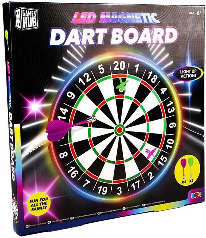 Et sikkert og festligt dartboard med LED-lysring og magnetpile – perfekt til familieaften, hyggespil eller børneværelset, hvor andet skarpt udstyr er uønsket.