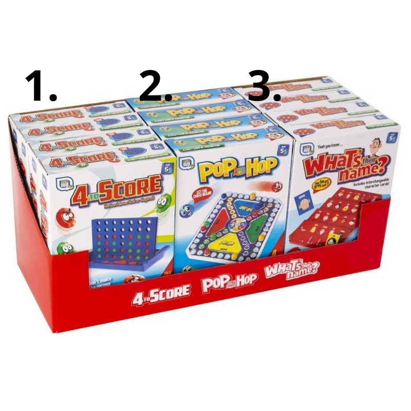 Perfekte rejsekammerater til turen! Travel Games leveres med små, bærbare spil som “4 to Score”, “Pop N Hop” og “What’s Name” — alle pakket kompakt, så de let kan tages med på farten.