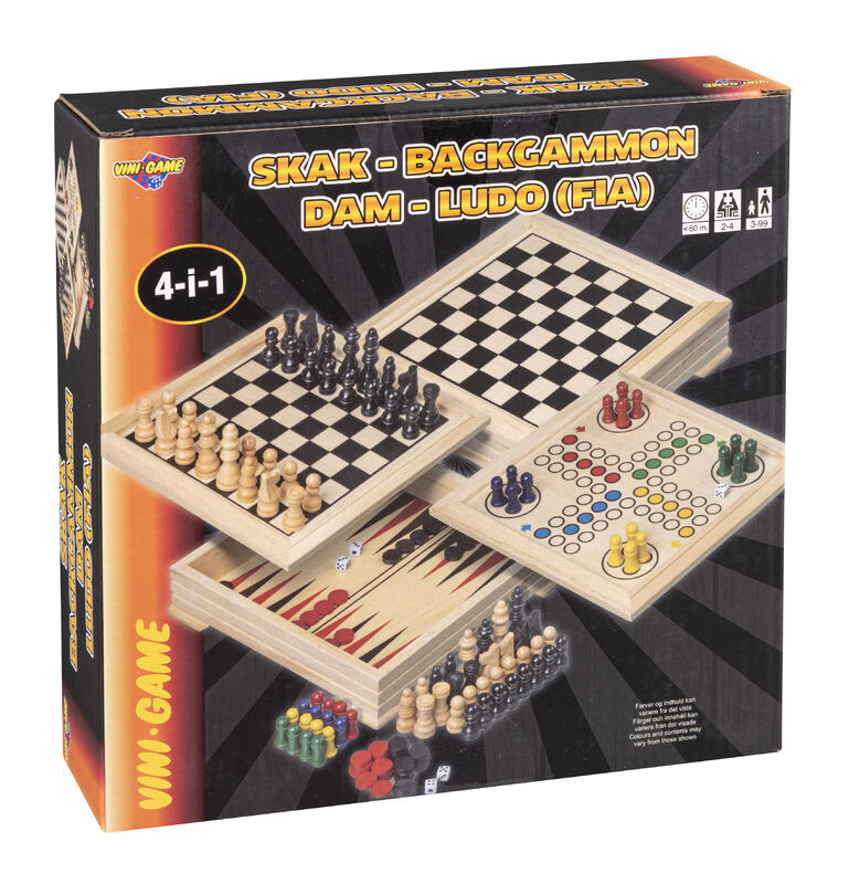 4-i-1 Træspil – Skak, Backgammon, Dam og Ludo