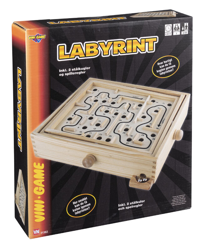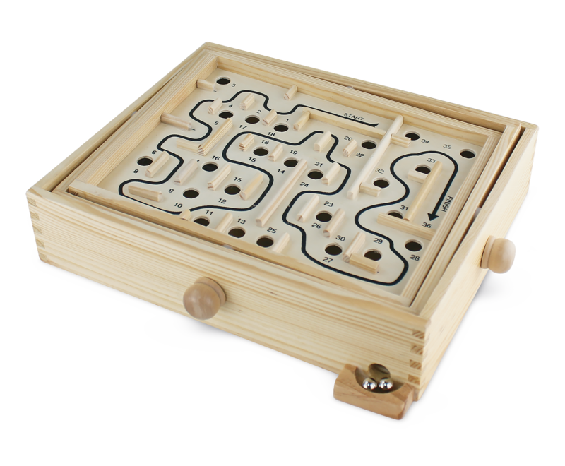 Det klassiske labyrintspil i træ – et sjovt og udfordrende spil, der kræver både tålmodighed og præcision. Vip pladen forsigtigt og før stålkuglen gennem labyrinten uden at falde i hullerne.