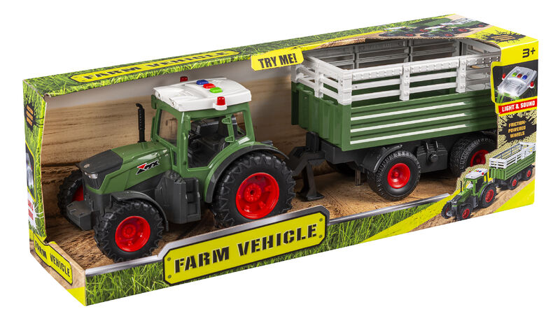 Klar til livet på landet med denne realistiske traktor med anhænger! Den har både lys, lyd og friktionsdrevne hjul for ekstra sjov leg.