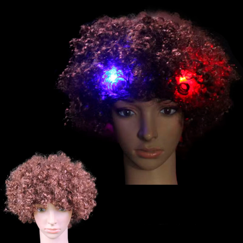 Gør dit outfit ekstra iøjnefaldende med denne lysende krøllede paryk med LED-lys. Perfekt til fest, udklædning, sportsevents, halloween og sjove lege, hvor der gerne må være lidt ekstra wow-effekt.