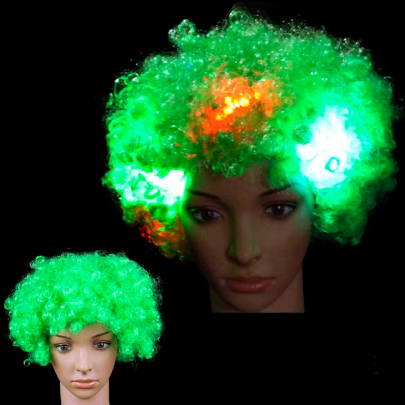 Parykken har indbygget LED-lys, som lyser flot op i mørke og gør den oplagt til både indendørs og udendørs arrangementer. Den er lavet i let fiber-materiale og har en størrelse på ca. 25 cm, hvilket giver et fyldigt og sjovt look.