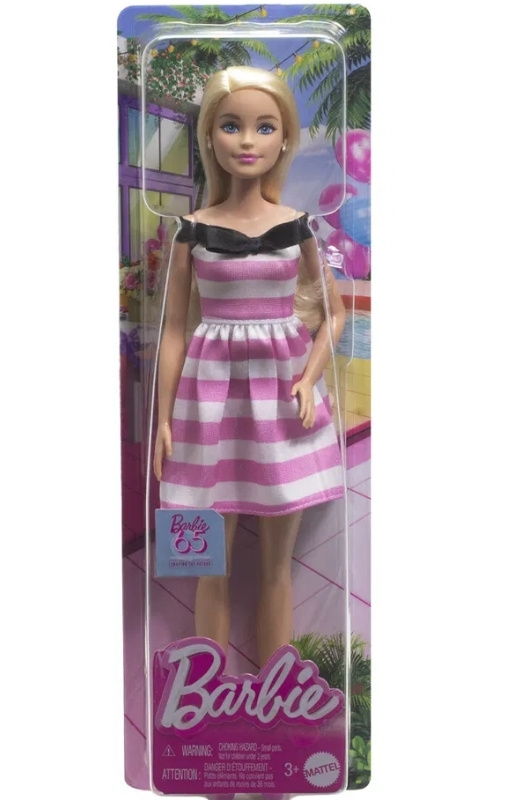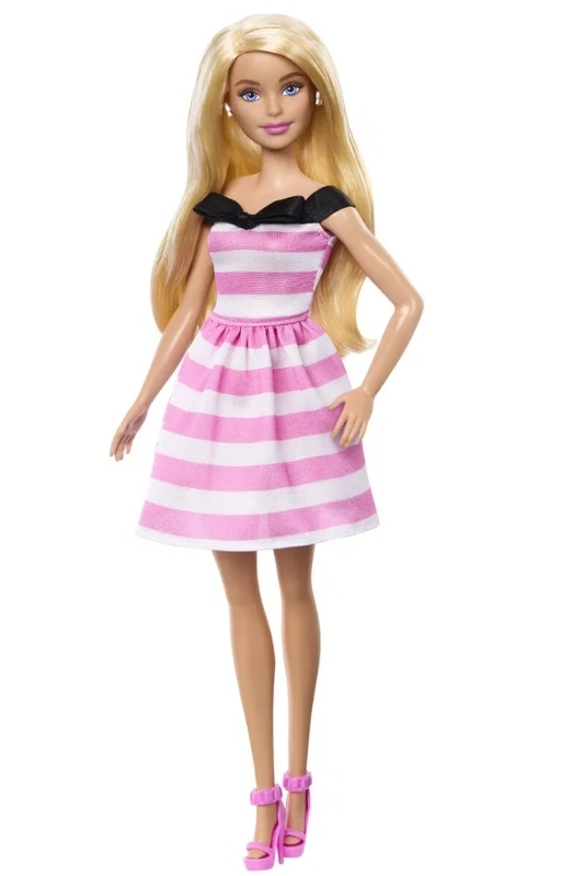Hun bærer en pink- og hvidstribet kjole med en sort sløjfe i halsudskæringen. Perleøreringe og pink højhælede sko fuldender hendes klassiske look! Denne dukke er en fantastisk gave til både børn og Barbie-fans og samlere i alle aldre.