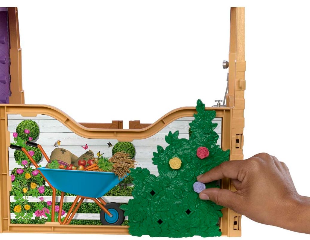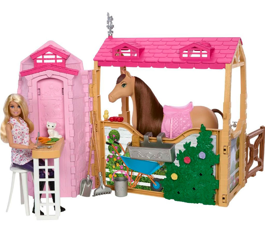 Dette flotte legesæt indeholder mere end 25 dele og byder på masser af sjov og kreativ leg. Stalden har seks legeområder, hvor Barbie kan fodre sin hest med grøntsager, vaske og pleje den, træne ved dressurhegnet, hænge præmiebånd op på trofævæggen, skifte billede på væggen og passe de smukke roser i haven.
