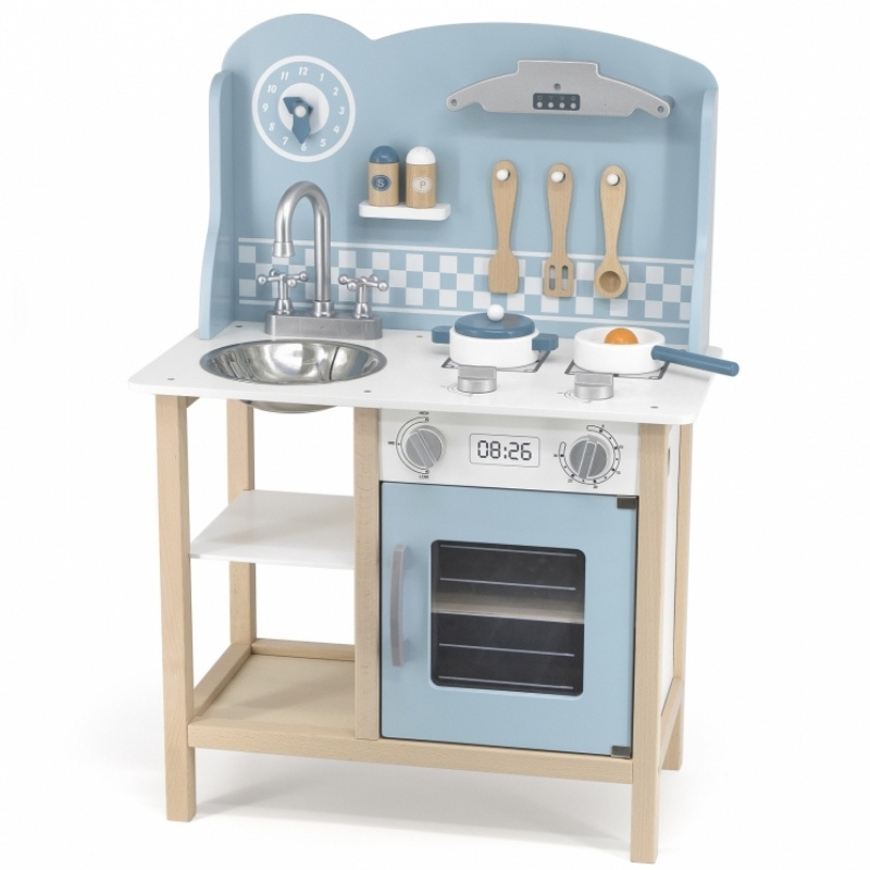 Køkkenet indeholder alle klassiske elementer – vask, komfur, ovn og emhætte – samt realistiske detaljer som bevægelige drejeknapper og en lille urfunktion, så barnet kan “holde øje” med maden under tilberedning.