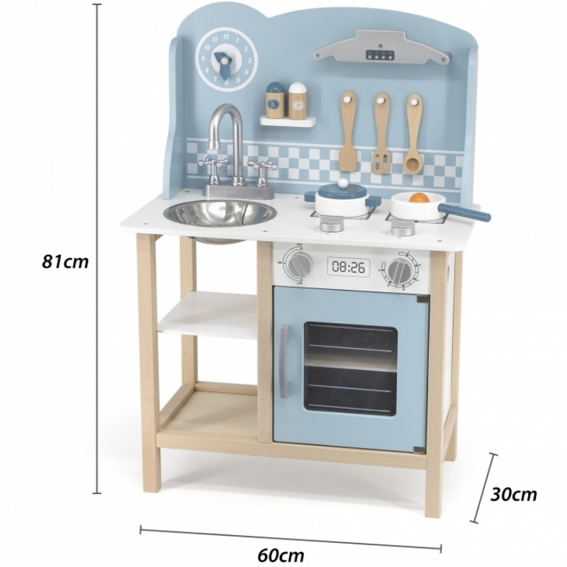 Køkkenet indeholder vask, komfur, ovn og emhætte samt realistiske detaljer som bevægelige knapper og et ur på fronten. Når barnet drejer på krydderiknappen, høres et klik, der gør legen endnu mere autentisk. Under vasken er der en praktisk hylde til opbevaring af mad eller tilbehør.