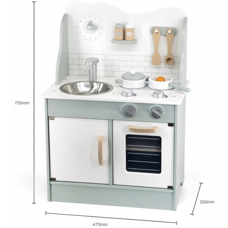 Køkkenet er udstyret med vask, komfur og ovn samt realistiske detaljer som drejeknapper og et ur på fronten. Når barnet drejer på krydderiknappen, høres et klik, som gør legen endnu mere levende. Under vasken findes et praktisk skab til opbevaring af mad eller tilbehør. Når maden er klar, kan barnet vaske op og begynde forfra.