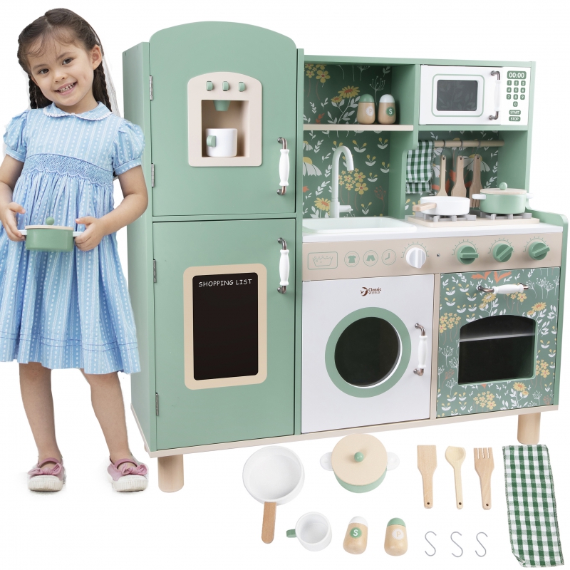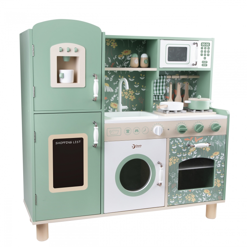 Køkkenet indeholder alt, hvad et lille hjemmekøkken kræver – vask, komfur, skabe, opvaskemaskine og endda en tavle til opskrifter eller indkøbslister. Det er fremstillet i høj kvalitet af massivt træ og malet med børnesikre, giftfri farver.
