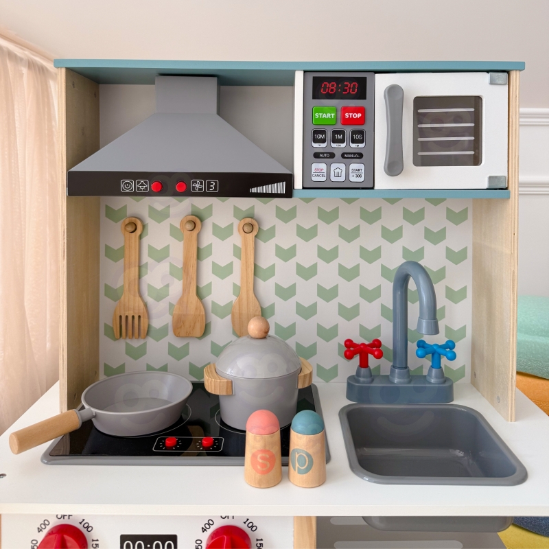 Køkkenet er udstyret med ovn, induktionskogeplade, mikroovn, emhætte og vask med hane – alt sammen i et gennemført design, der appellerer til små kokke med store ambitioner. Lys- og lydeffekter gør legen endnu mere virkelighedstro, mens de mange tilbehør giver mulighed for timevis af kreativ rolleleg.