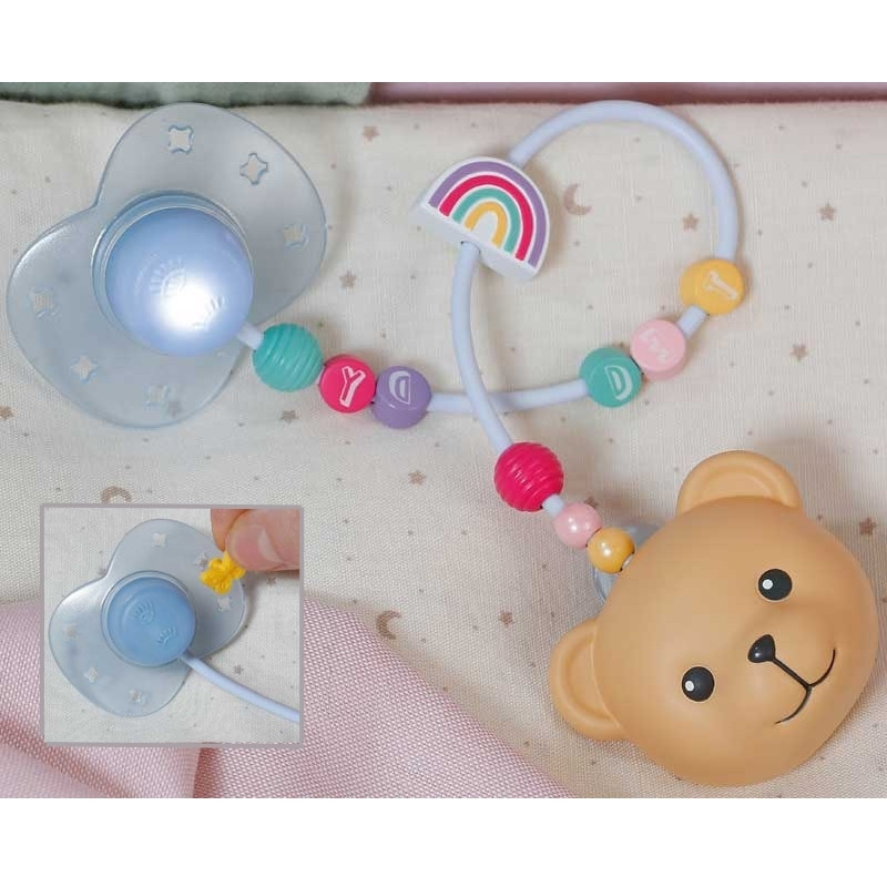 Sutten har et sødt design med bamse og regnbue og kan nemt sættes fast på dukkens tøj med den praktiske clips. Når sutten bruges, aktiveres en blid godnatsmelodi og et roligt lys, som skaber en hyggelig stemning ved sengetid.