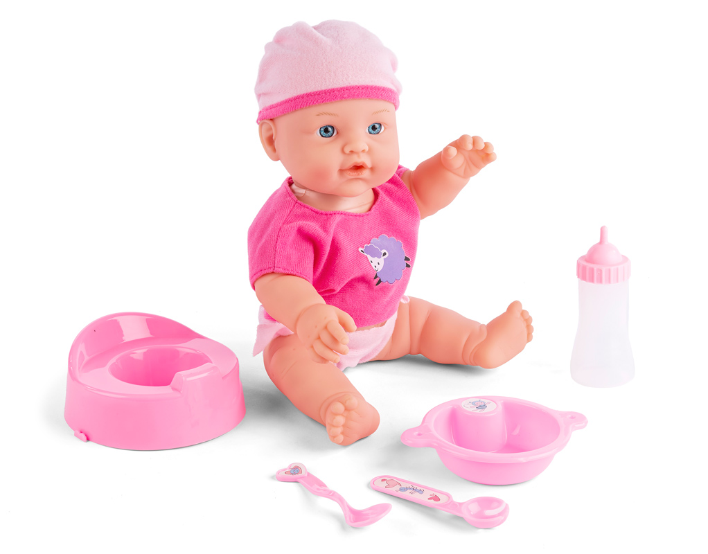 Der er tilbehør med til dukkesættet som: sutteflaske, baby ske & gaffel, en tallerken samt en potte.