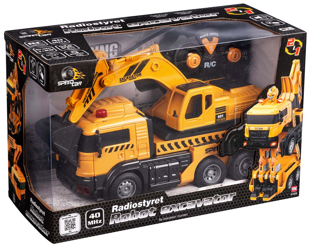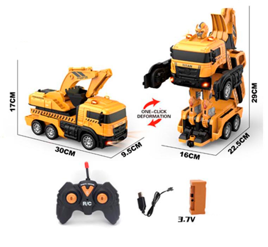 Fjenstyret lastbil der kan transformere sig til en sej robot, kun ved et tryk på fjernkontrollen. Når du køre med bilen eller robotten er der lys og lyd i. Super sej fjernstyret bil som kan transformeres.