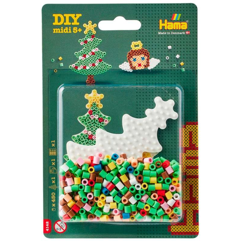 Blisterpakningen indeholder ca. 450 assorterede Hama midi perler samt alt, hvad der skal bruges for at lave et sødt lille juletræ i perler.