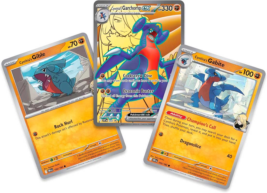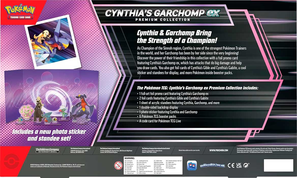 Sættet indeholder et full-art foil promo-kort med Cynthia’s Garchomp ex, som både kan lave stor skade og hjælpe dig med at trække kort under spillet. Der følger også foil-kort af Cynthia’s Gible og Gabite, så du får hele udviklingslinjen samlet. Derudover får du et ark med akrylstandere, en dobbeltsidet display-baggrund, et foto-sticker samt 6 boosterpakker fyldt med nye kort til samlingen.