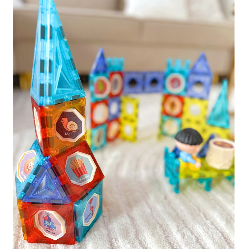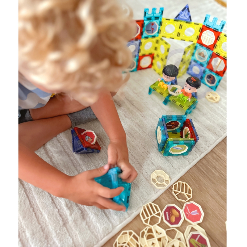 De magnetiske klodser i dette sæt gør det nemt for børn at sætte elementerne sammen og skabe stabile konstruktioner uden brug af lim eller løse dele. Ved at bygge et slot, en borg eller fantasibygninger får barnet mulighed for at eksperimentere med former, farver og rumlig opbygning.