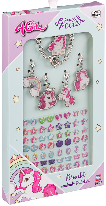 Skønt enhjørning armbåndssæt med utrolig mange dele. Der er et fint armbånd med ekstra vedhæng samt masser af små søde stickers til at sætte ovenpå egne og venindernes negle.