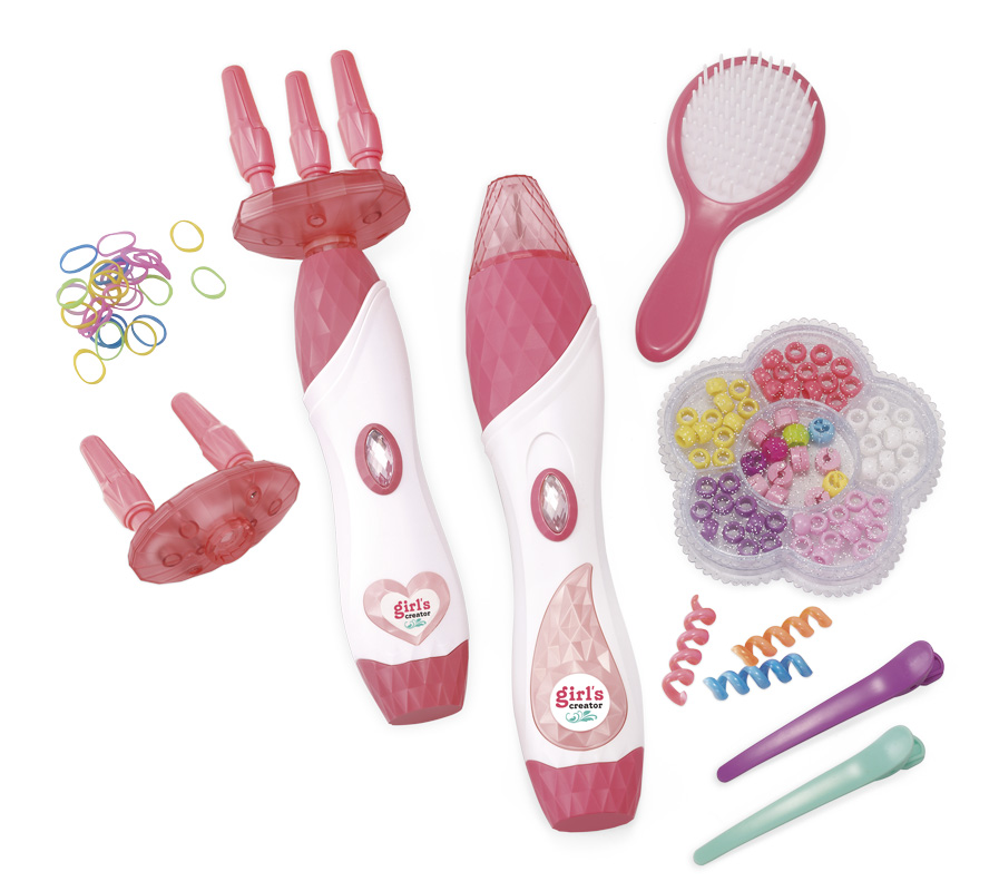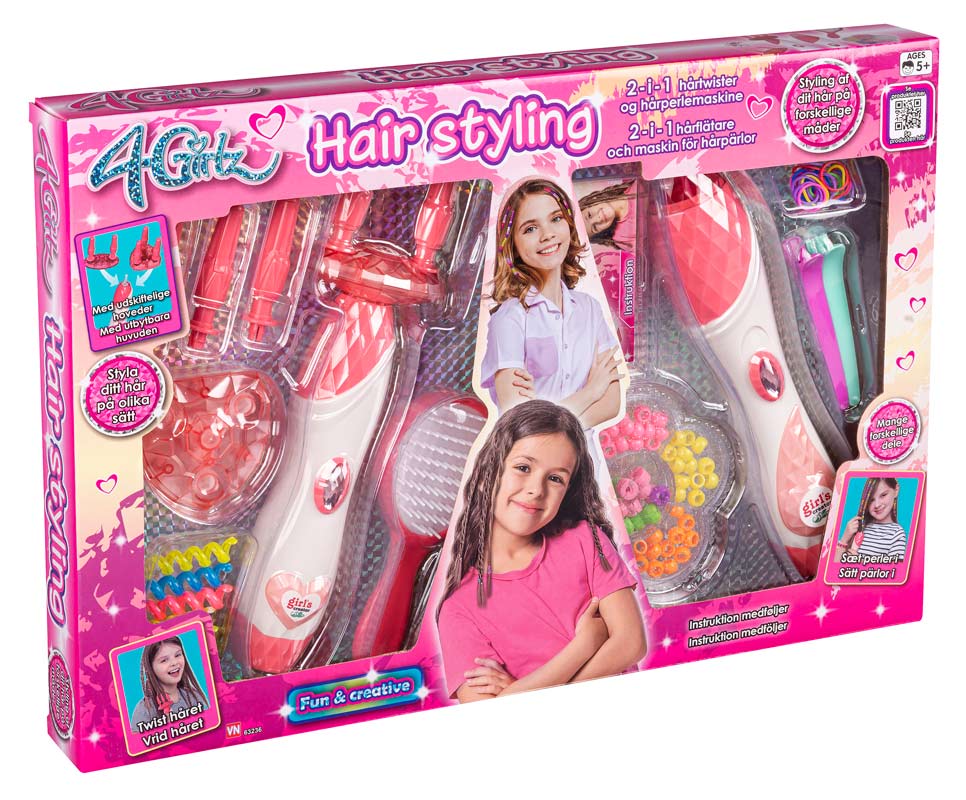 Du får en hårperlemaskine som gør det super nemt at dekorere håret med perler, 2-i-1 hårtwister med 2 forskellige hoveder til at flette håret med, børste, perler, hårspiraler, hårklemmer og elastikker samt udførlig instruktioner.