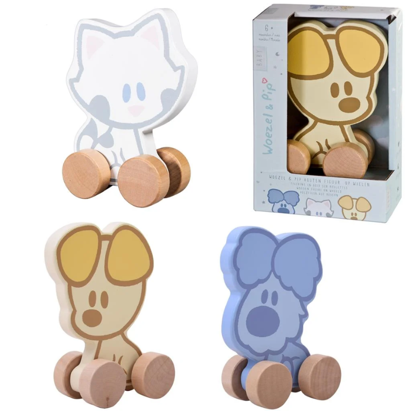 Denne søde Woezel og Pip træ figur med hjul er perfekt til de mindste børn, der elsker at lege og trille deres legetøj rundt. Figuren er lavet i træ og har et enkelt og børnevenligt design.