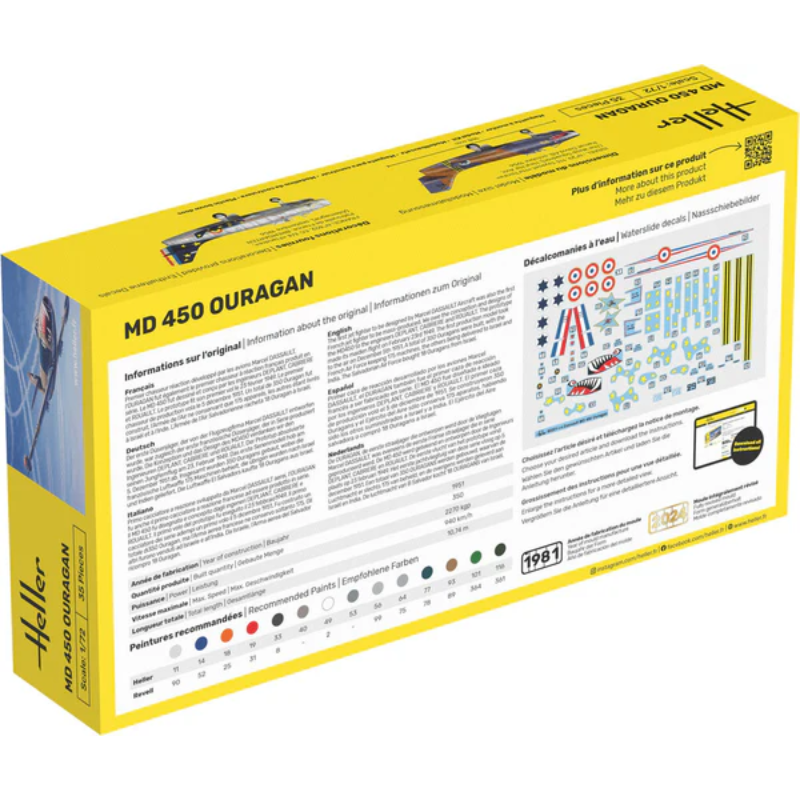 Detaljeret model af det franske jetjagerfly MD 450 Ouragan, et af de første operative jetfly fra Frankrig efter 2. verdenskrig. Modellen har fine overfladedetaljer og autentisk udformning og er velegnet til både samlere og modelbyggere med interesse for tidlige jetfly.