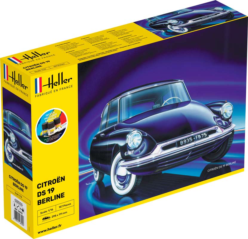 Heller stor Citroën DS 19 som kommer med forhjul der kan dreje, døre der kan åbnes, motorhjelm der kan være åben eller lukket samt kig til motoren. Bilen er en model fra 1960 og kommer med mange fine detaljer.