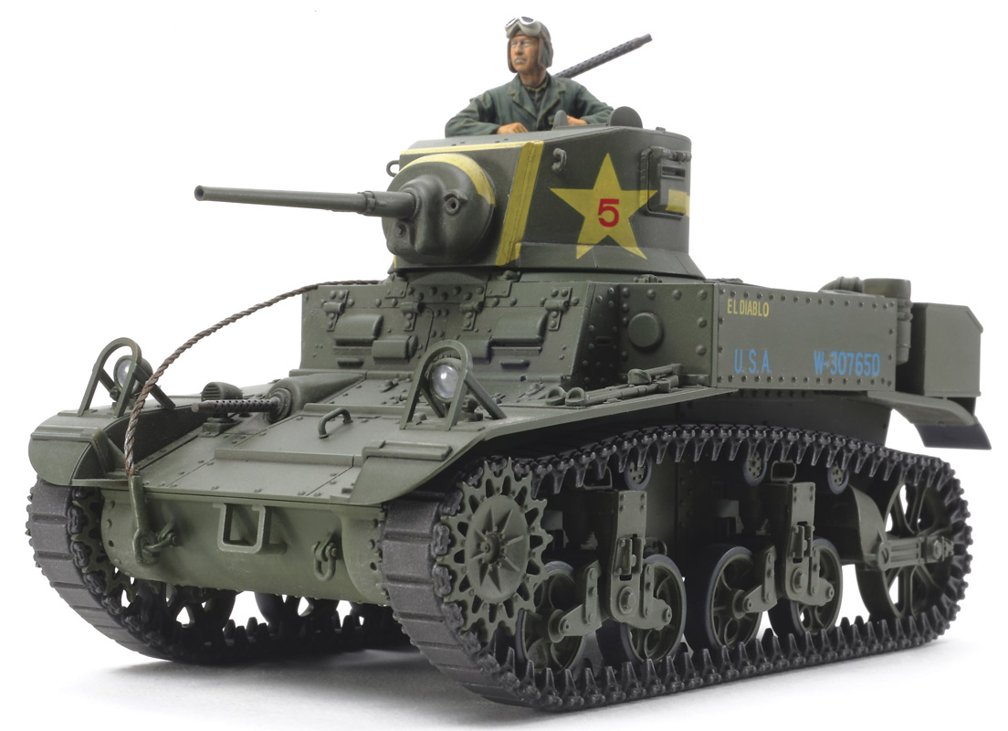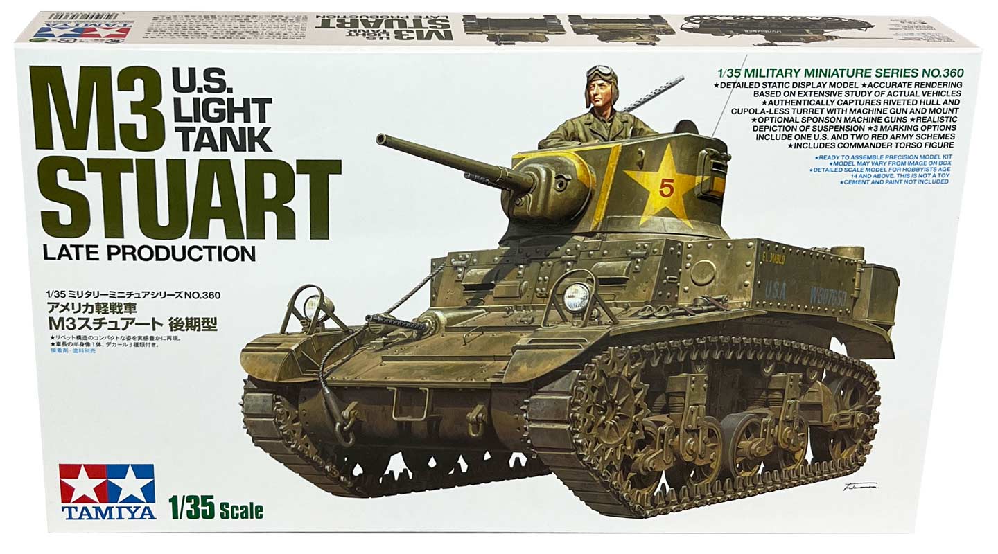 Tamiya M3 U.S Light Tank "Stuart" modelkampvogn. Kampvognen er med sin længde på 12,9 cm lavet i størrelsesforholdet 1:35.