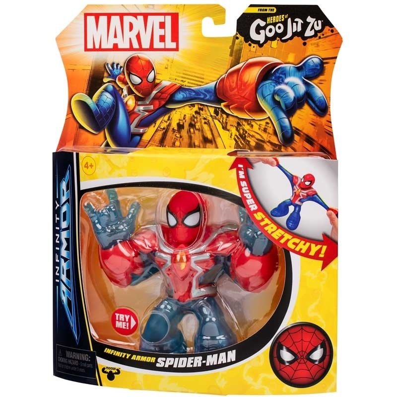 Marvel Super Heroes og Heroes of Goo Jit Zu er gået sammen for at skabe de ultimative superhelte med stræk, styrke og sjov! Infinity Armour Spider-Man er fyldt med en unik, squishy metallisk gel, som giver en helt særlig følelse, når du klemmer og strækker figuren.