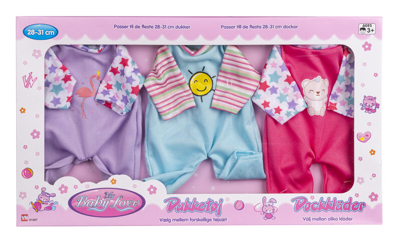 3 søde sæt tøj med forskellige motiver på.  Dukketøjet passer til de fleste dukker i størrelsen 28-31cm og kommer i flere forskellige farver. Med 3 forskellige sæt kan barnet skifte til lige det der passer dem bedst.