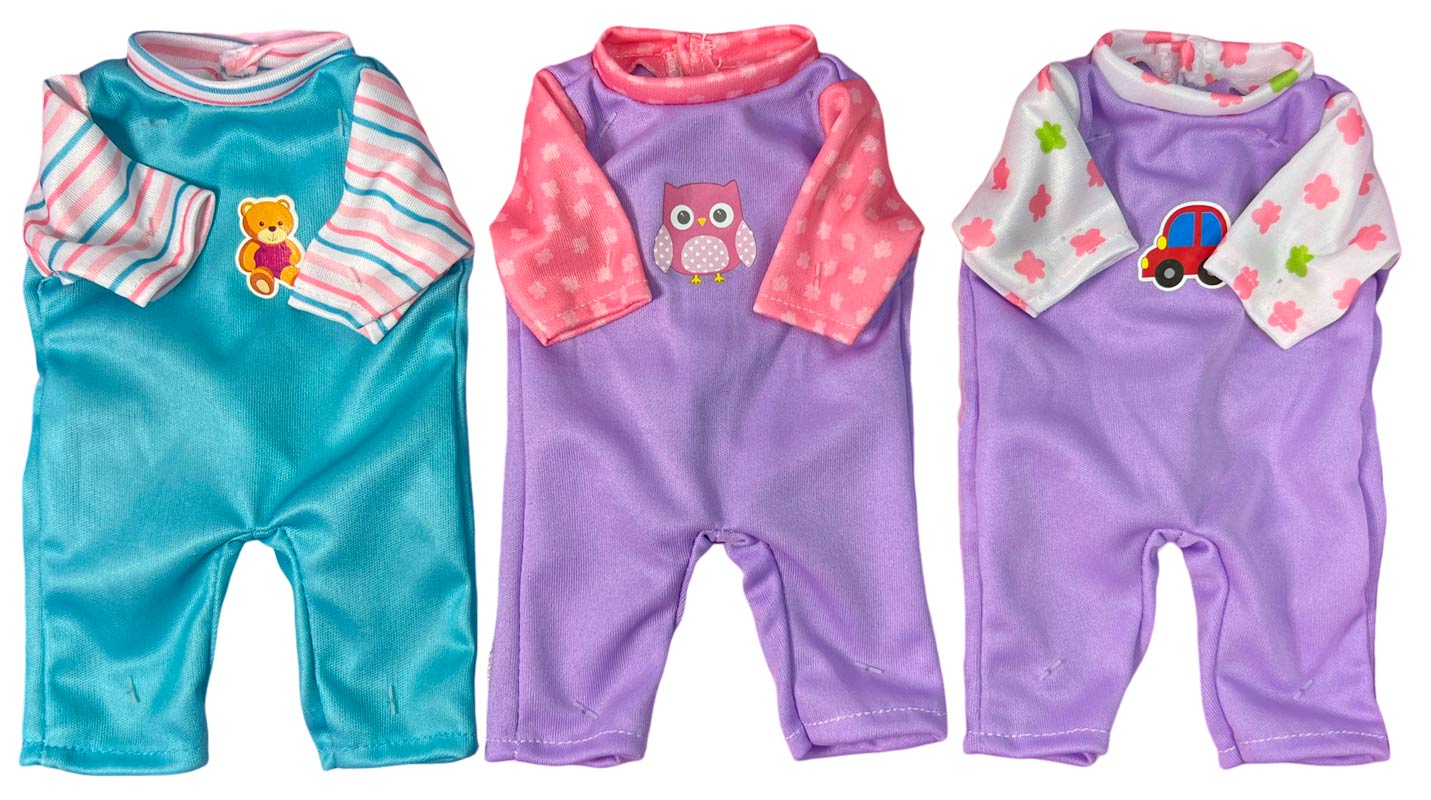 3 søde heldragter med forskellige motiver på. De kommer med en lille bamse, ugle og en lille bil. Dukketøjet passer til de fleste dukker i størrelsen 30-33cm og kommer i flere forskellige farver. Med 3 forskellige sæt kan barnet skifte til lige det der passer dem bedst.