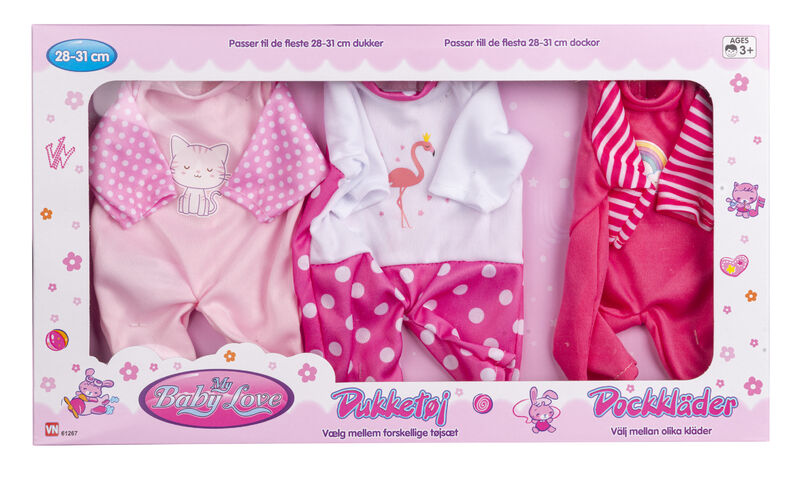 3 søde sæt tøj med forskellige motiver på.  Dukketøjet passer til de fleste dukker i størrelsen 28-31cm og kommer i flere forskellige farver. Med 3 forskellige sæt kan barnet skifte til lige det der passer dem bedst.
