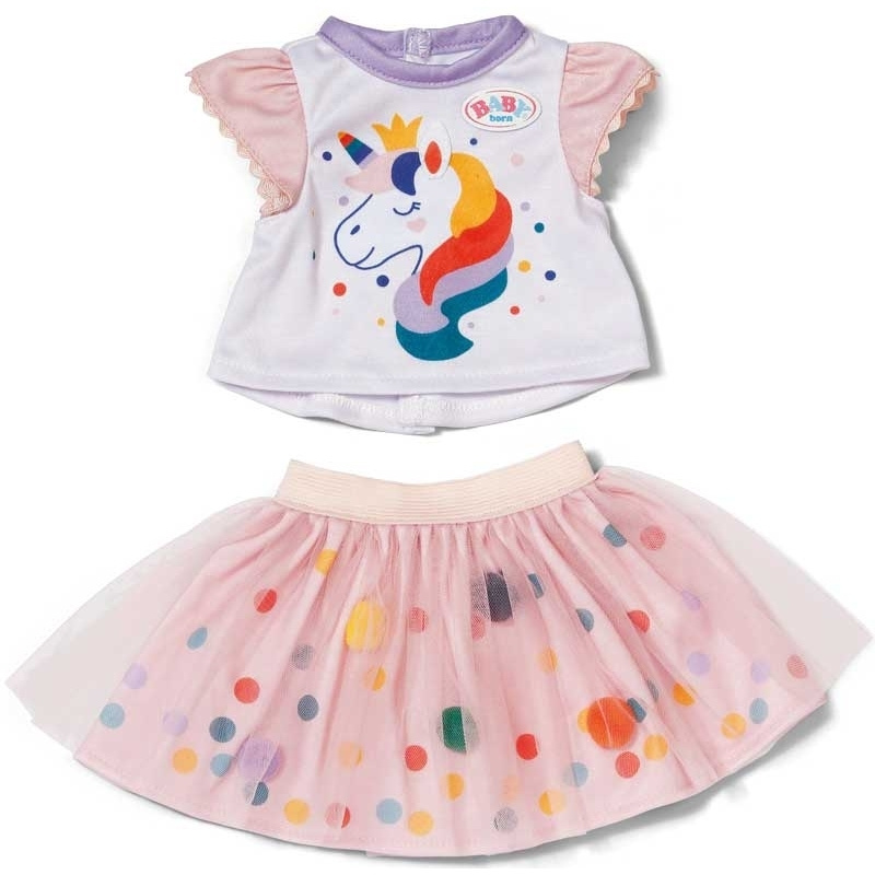 Gør dukkelegen festlig og farverig med BABY born Tylkjole med Enhjørningemotiv – 43 cm. Denne fine todelte kjole bringer glæde og fantasi ind i dukkens garderobe.