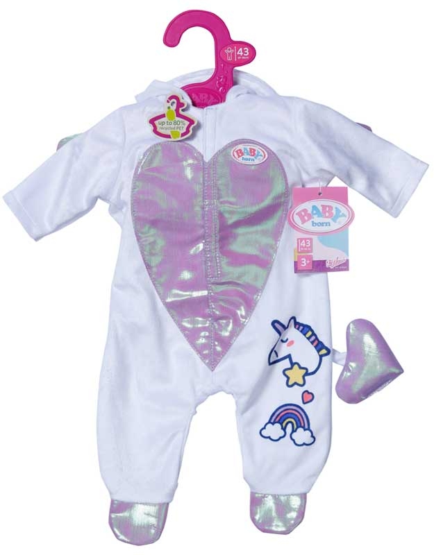 Denne BABY born Unicorn Onesie er det ultimative udklædningssæt til små enhjørningefans. Dragten er lavet i blødt, hvidt plys og har en hætte med små ører, fluffy manke og et glitrende enhjørningehorn. Bagpå finder du både små vinger og en hjerteformet hale, som gør outfittet ekstra magisk. Den er perfekt til rolige hjemmedage, hyggelige gåture eller fantasifuld rolleleg med BABY born. Den passer til alle dukker på 43 cm og er et hit hos børn, der elsker at klæde deres dukker ud.