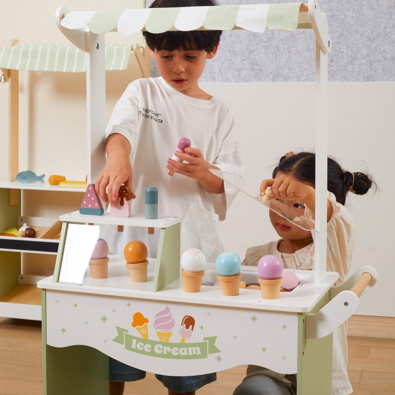 Denne charmerende træ-isbod fra Viga giver børn mulighed for at sælge og servere is på legende vis. Med ispinde, vafler og en magnetisk isske bliver legen både realistisk og kreativ.