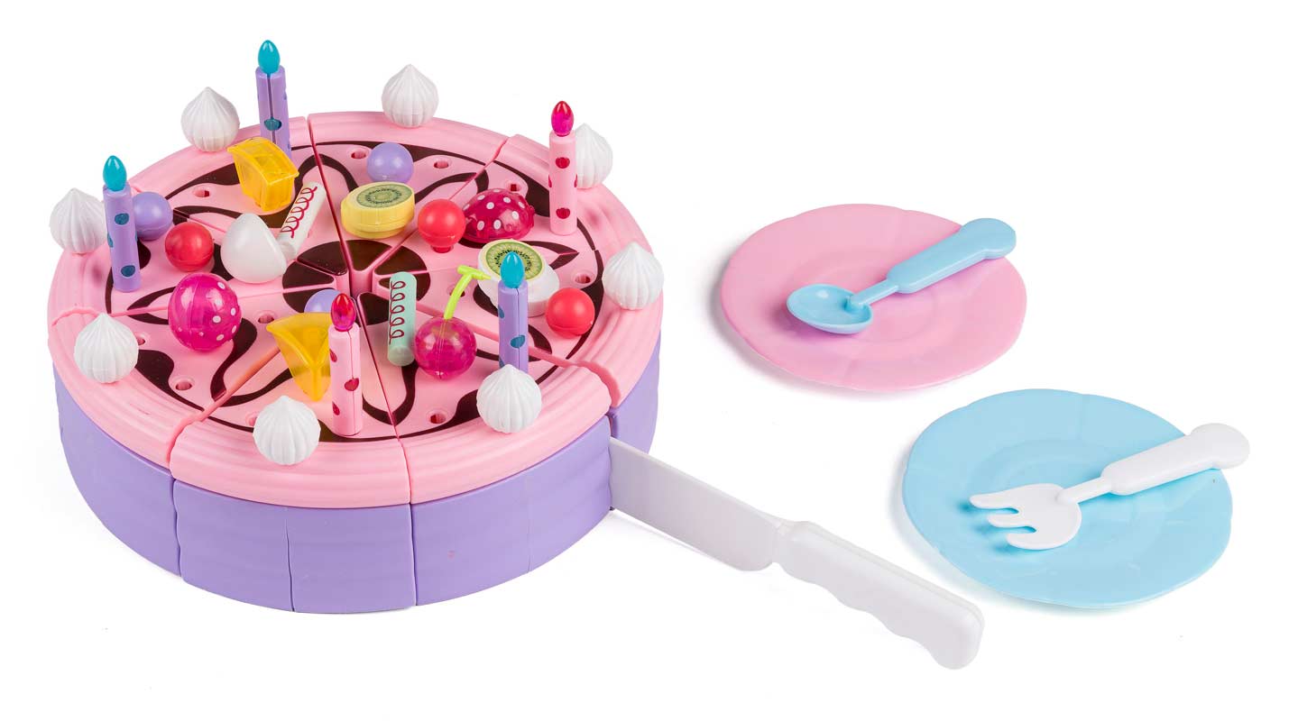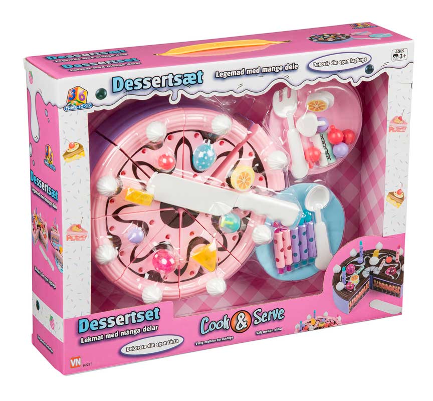 Dessertsæt med lagkage. Dekorer din egen lagkage. Inkl. kagekniv, tallerkner, gaffel, ske og masser af forskelligt pynt.