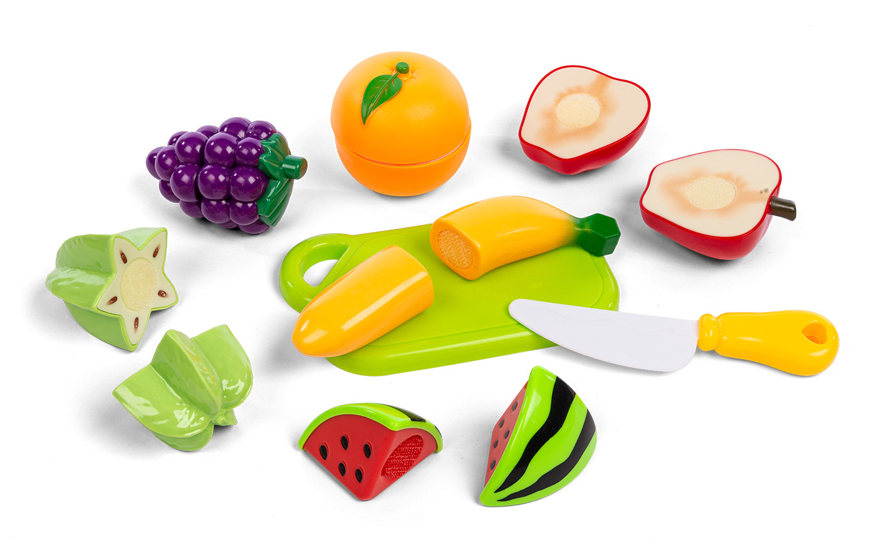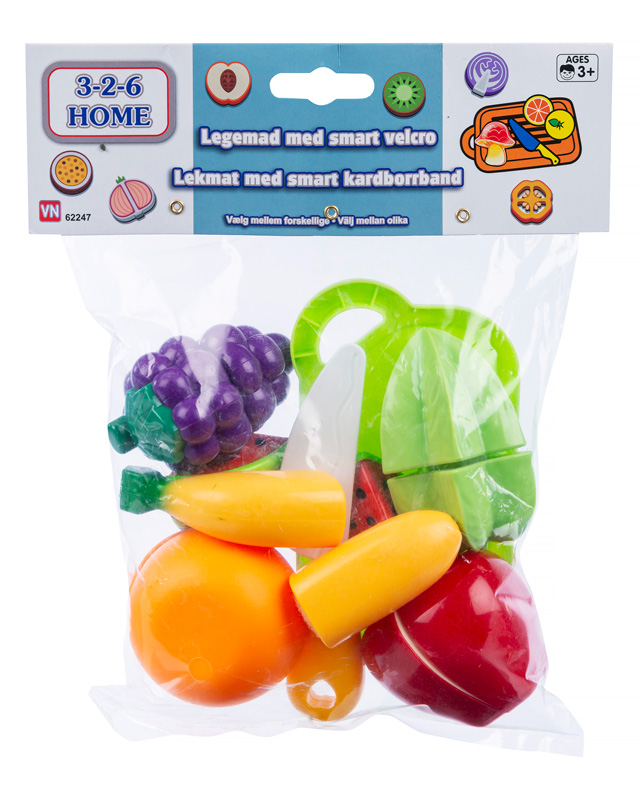 Masser af spændende velcro legemad. Du får frugt som: vindruer, appelsin, æble, vandmelon og en banan. Dertil er der en lille plastikkniv og et spækbræt så man kan "skære" tingene ud på.