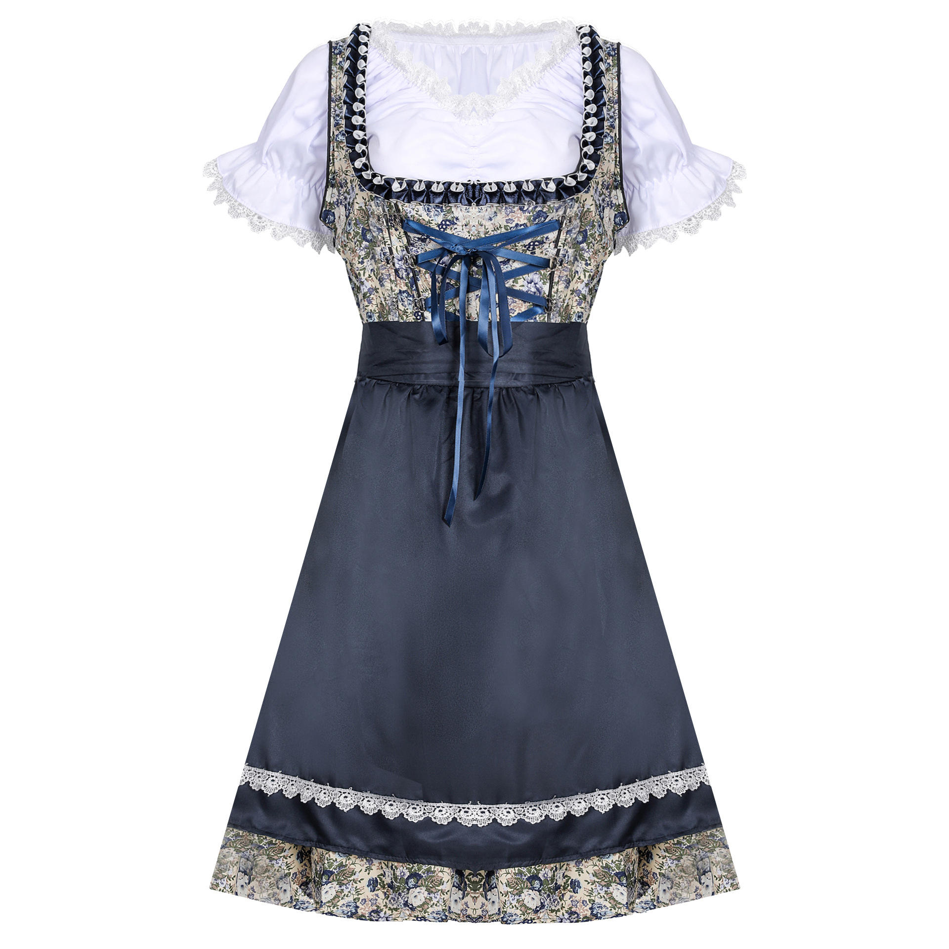 Den snørede front fremhæver taljen og giver det autentiske bayerske look, mens blomsterdesignet giver kjolen et feminint og traditionelt udtryk. Perfekt til Oktoberfest, temafester, bierfest eller andre festlige begivenheder, hvor du ønsker det klassiske tyrolerlook.