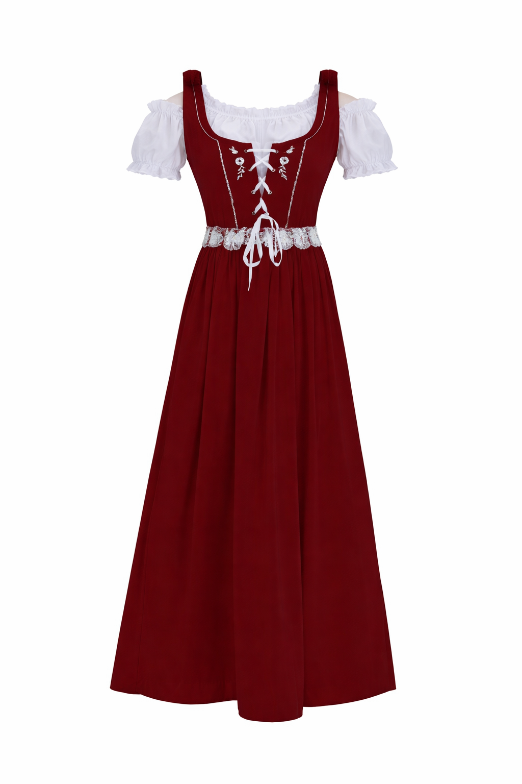 Smuk og klassisk tyrolerkjole i elegant rød med traditionelle dirndl-detaljer. Kjolen har en flot overdel med snørelukning og dekorative detaljer, som giver et autentisk bayersk udtryk. Den hvide bluse med korte pufærmer skaber en flot kontrast til den røde kjole og giver det velkendte Oktoberfest-look.