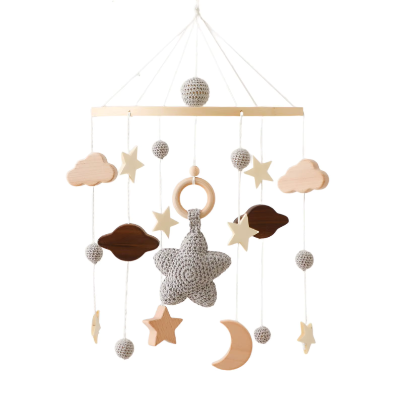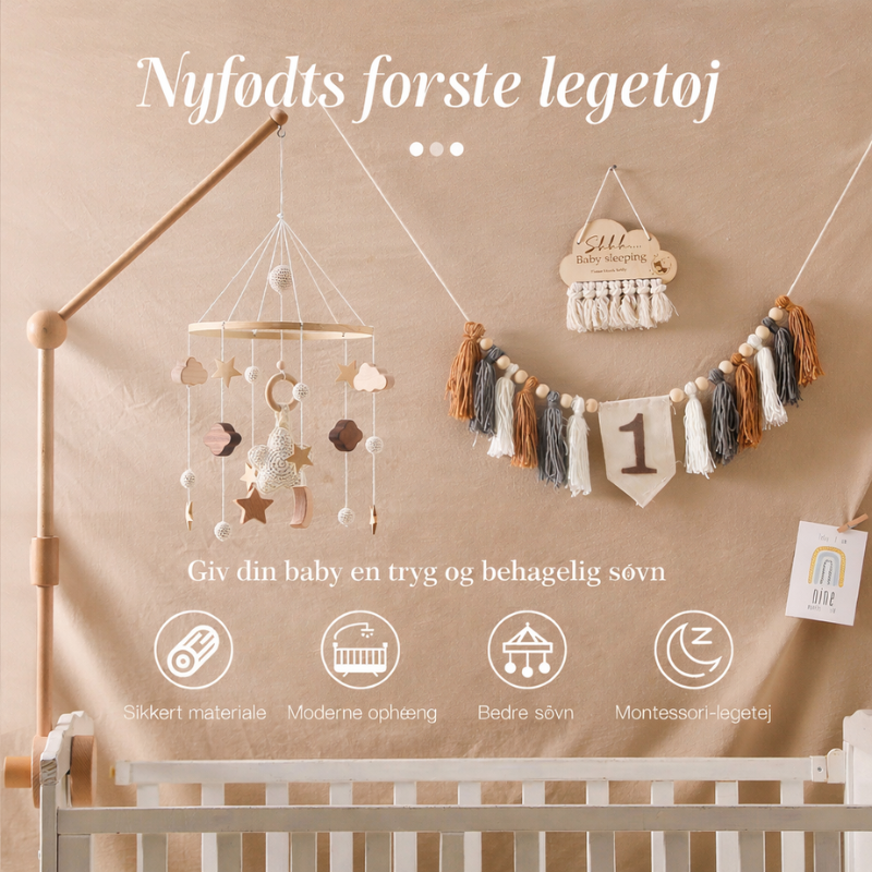 De bløde farver og naturlige træelementer bevæger sig stille og roligt, hvilket hjælper med at berolige din baby og gøre det lettere at falde i søvn. Perfekt til brug over tremmeseng, puslebord eller vugge.
