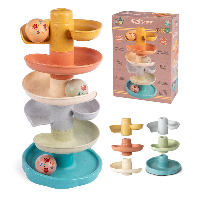 Farverigt balleksperimenttårn med 3 kugler, der ruller ned ad de forskellige niveauer. Designet til at hjælpe babyer med at udvikle motorik, koordination og forståelse af bevægelse.