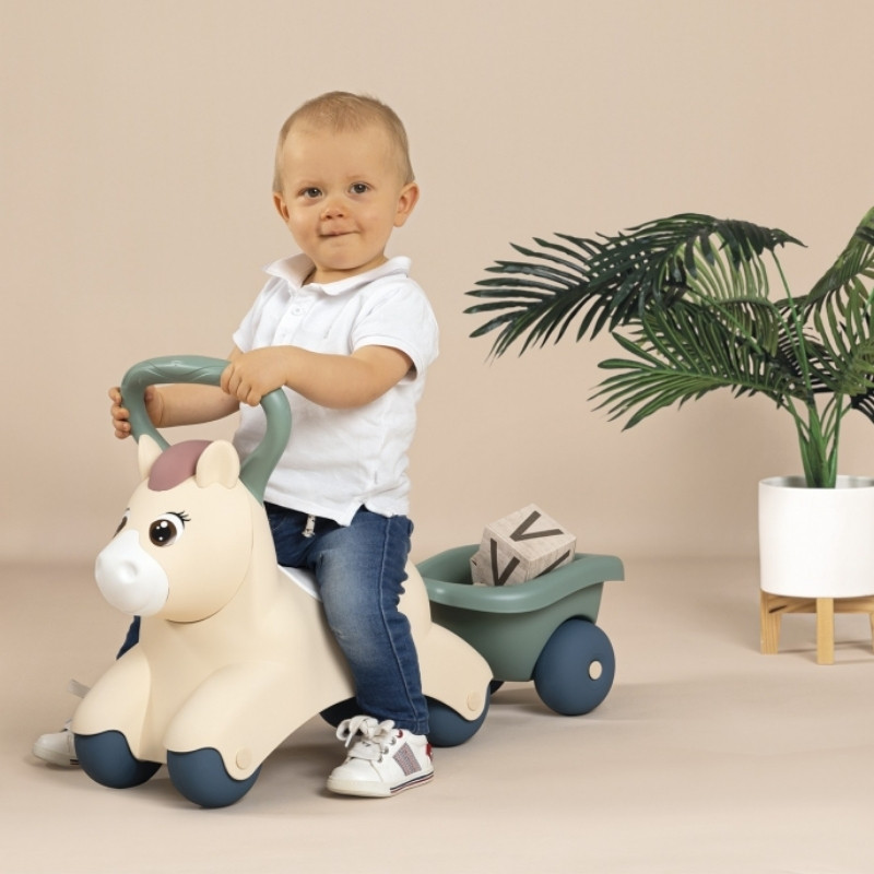 SMOBY Little Ride-On Pony med Trailer kombinerer sikkerhed, funktionalitet og leg på bedste vis – en skøn introduktion til barnets første transportmiddel.