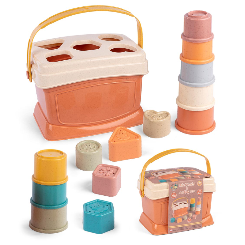 Sættet indeholder både stabelkopper og formblokke, som giver barnet mulighed for at stable, matche og lære om farver og former. Den medfølgende opbevaringsboks gør det nemt at holde orden på legetøjet.