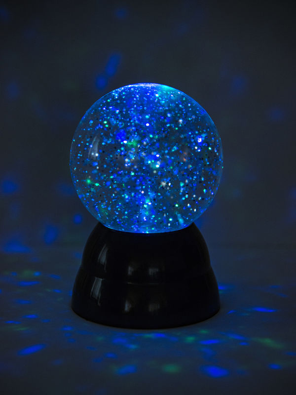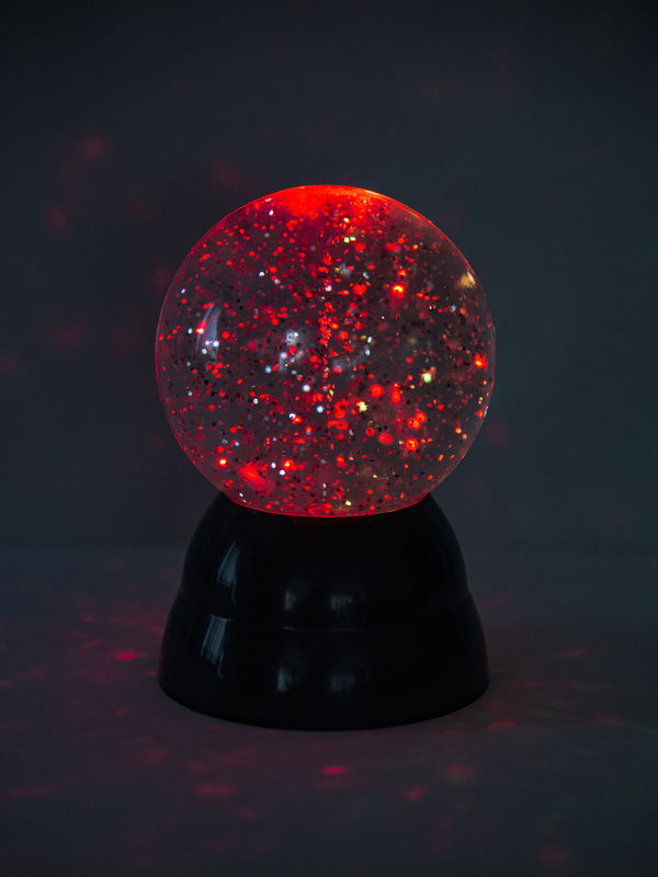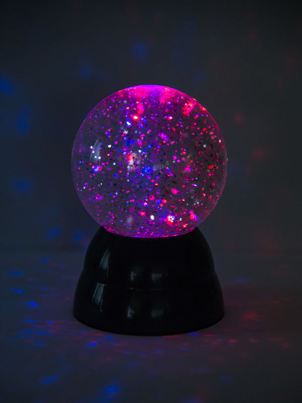 En glitter kugle giver hygge stemning på værlset med lys i flotte farver.