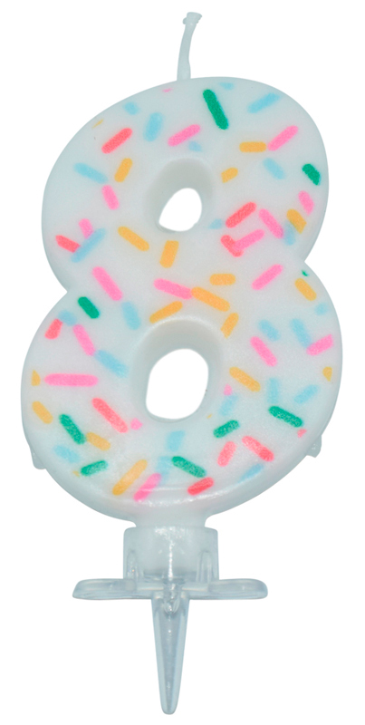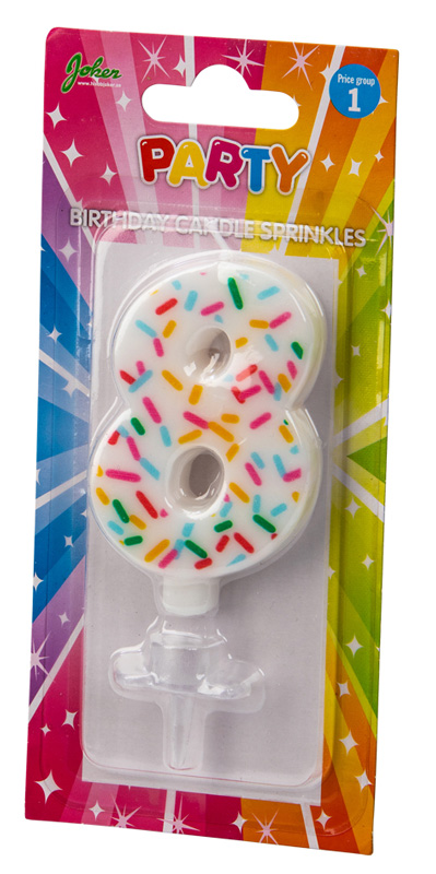 Ingen fødselsdagskage uden lys. Pynt kagen med dette flotte fødselsdagslys formet som tallet 8, dekoreret med farverig krymmel. Perfekt til at markere fødselsdagsbarnets alder og skabe festlig stemning.