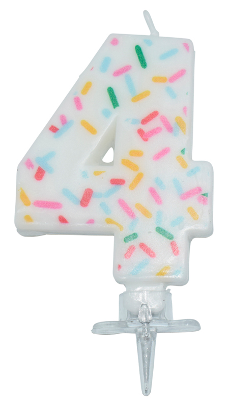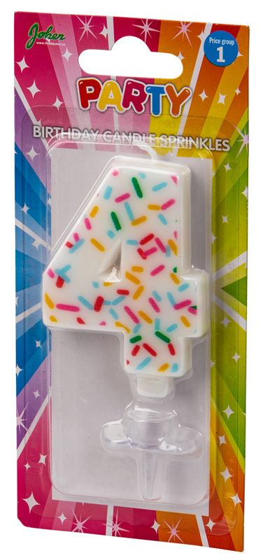 Ingen fødselsdagskage uden lys. Pynt kagen med dette flotte fødselsdagslys formet som tallet 4, dekoreret med farverig krymmel. Perfekt til at markere fødselsdagsbarnets alder og skabe festlig stemning.