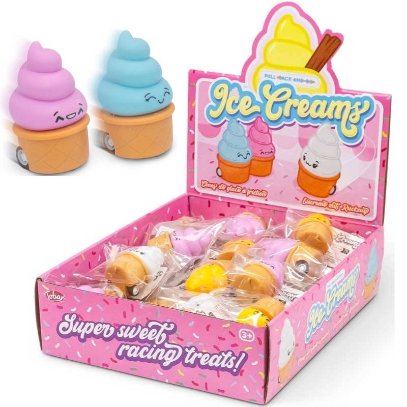 Softice med pull-back effekt er søde og sjove legetøjsbiler formet som små is, der straks bringer et smil frem. Hver is-bil er dekoreret i en livlige farver og har et nuttet ansigt, der giver masser af charme og personlighed.
