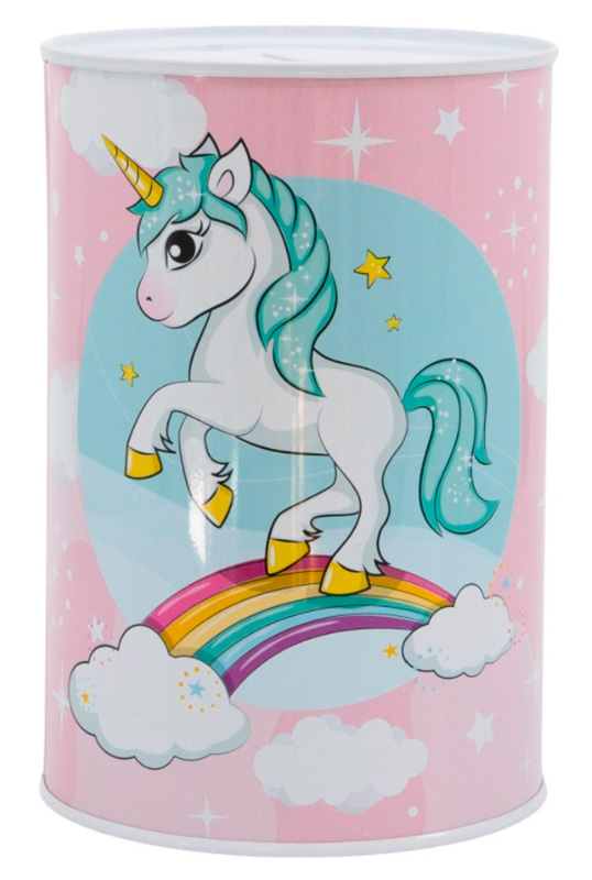 Gør opsparing ekstra magisk med denne enhjørning sparegris i metal med et farverigt og eventyrligt unicorn-motiv. Perfekt til børn, der elsker fantasi, farver og sjove figurer – og som gerne vil lære at spare deres mønter op på en sjov måde.