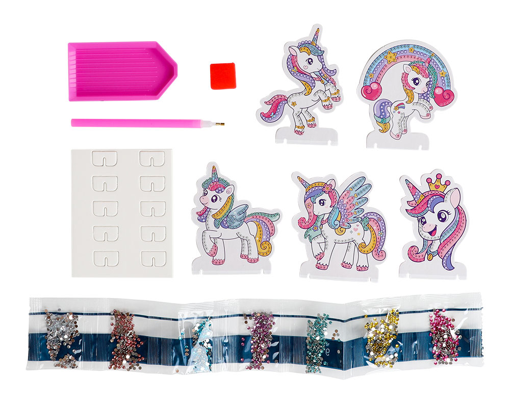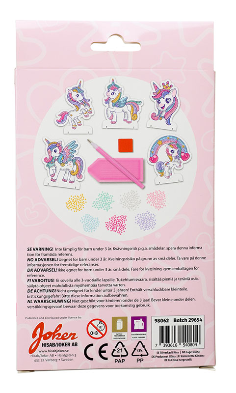 Sættet indeholder materialer til 5 forskellige enhjørningemotiver og 7 farver perler. De færdige motiver kan stilles op og bruges som pynt på børneværelset. En oplagt gaveidé til kreative børn, der elsker enhjørninger og krea-projekter.