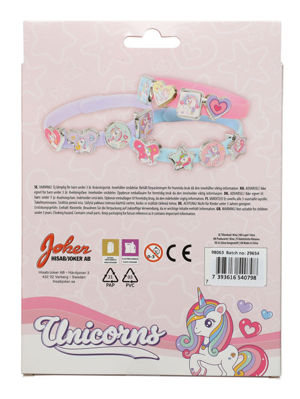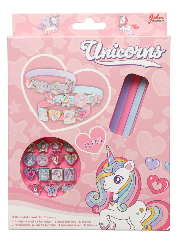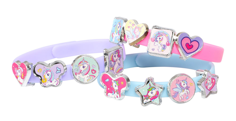 Armbåndene er nemme at tage på og af, og charms kan udskiftes igen og igen. En oplagt gaveidé til børn, der elsker smykker, enhjørninger og kreativ leg.