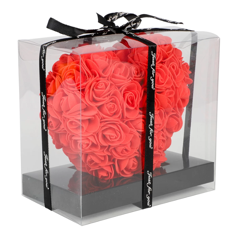 Rosenhjertet leveres i en elegant transparent gaveæske med dekorativt bånd, klar til at blive givet som gave.
