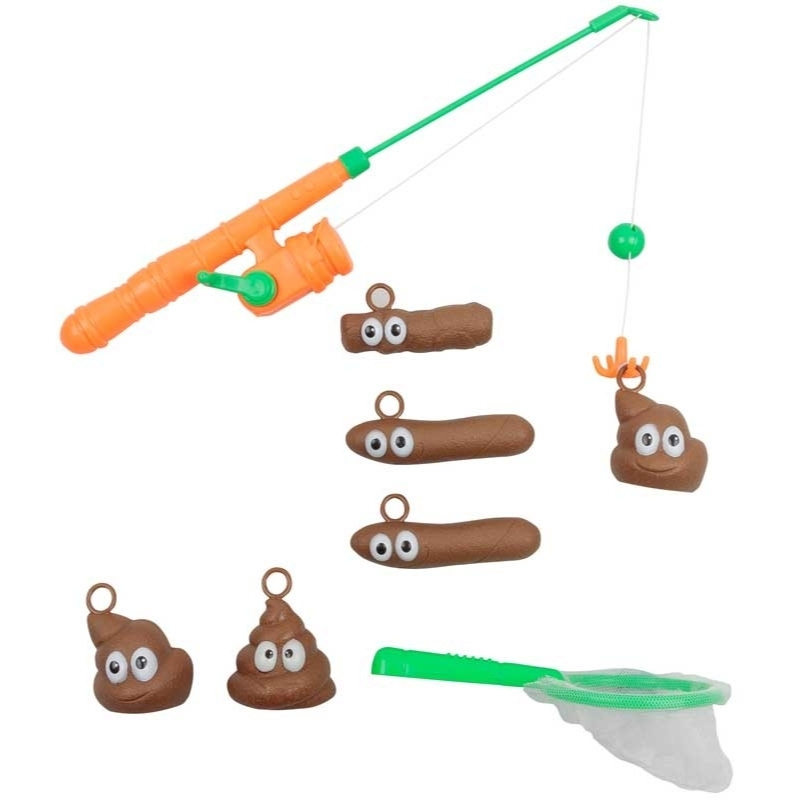 Sættet indeholder en fiskestang, et net og seks flydende plastik-poops, der hver har en lille løkke, så de er nemme at fange. Læg dem i badet eller en balje med vand, og konkurrér om, hvem der kan fiske flest op! Brug det i badetiden eller som festligt indslag til arrangementer!